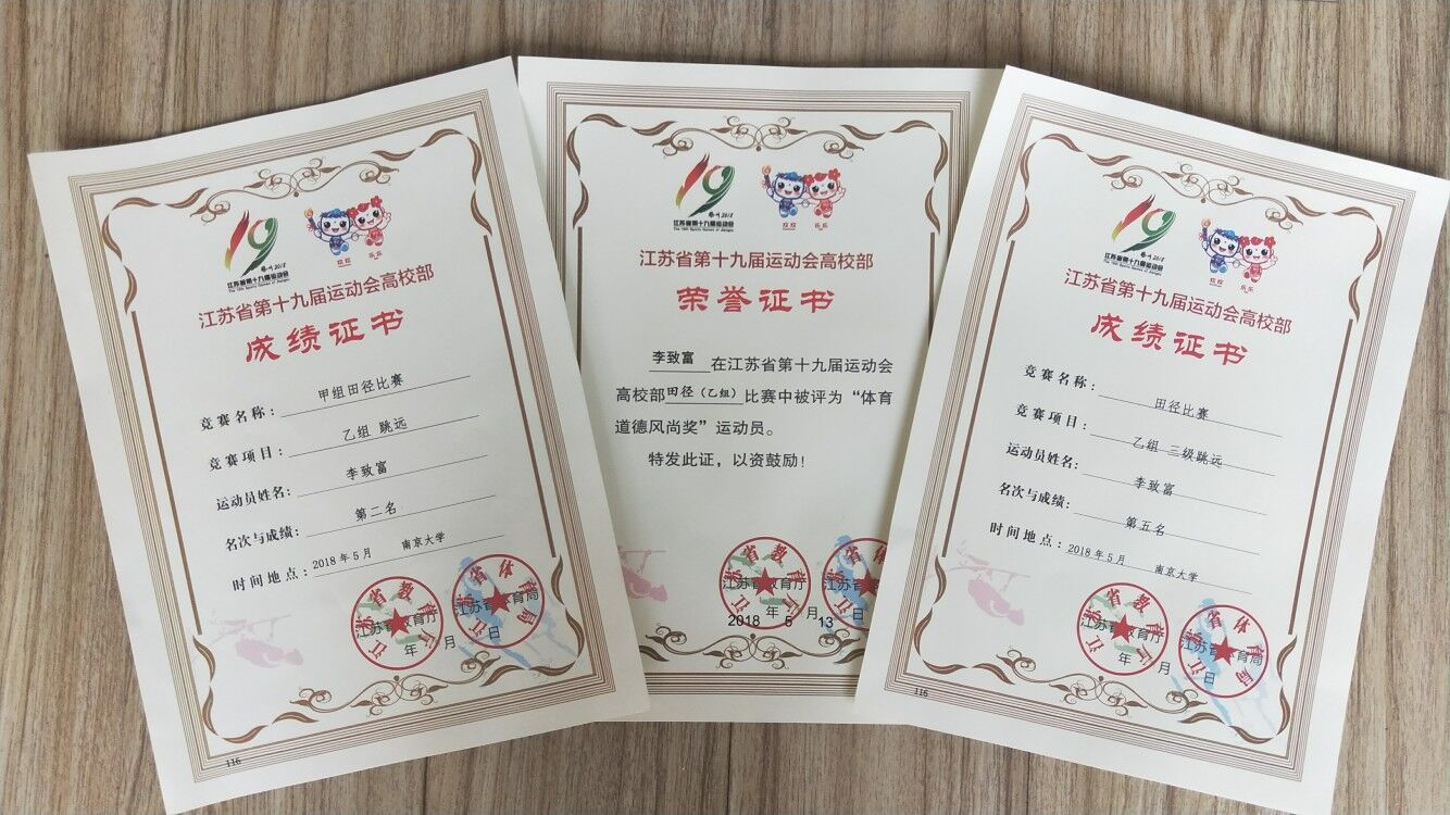 5月9-13日,我院田径代表队参加了在南京大学仙林校区举办的江苏省第十九届运动会高校部(乙组)田径比赛。我院运动员李致富同学在跳远、三级跳远分别获得亚军和第五名,并被评为“体育道德风尚奖”运动员称号,为学校争取了荣誉。