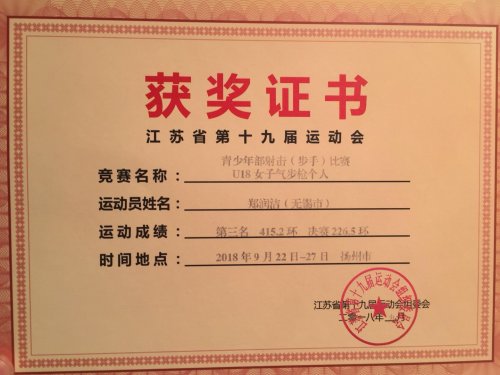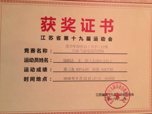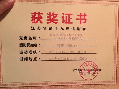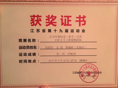 在刚刚结束的江苏省第十九届运动会射击比赛中,我院旅游学院郑润洁代表无锡市以1726环获得U18女子运动步枪三种姿势团体冠军,同时还以决赛448.3环成绩获得U18女子三种姿势个人亚军、以决赛226.5环获得U18女子气步枪个人季军、以决赛428.7环获得U18气步枪混合团体季军好成绩,为无锡市体育代表队完成省运会比赛任务做出了积极贡献,为学校赢得了荣誉。